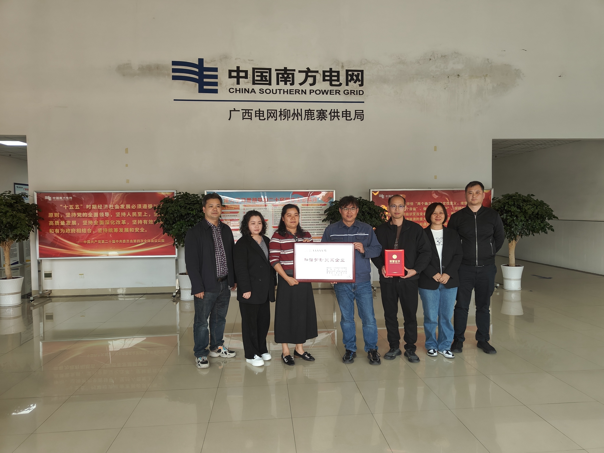 12月9日,鹿寨县人力资源和社会保障局、总工会、科技工贸和信息化局、工商业联合会,在鹿寨供电局、国能广投柳州发电有限公司举行“鹿寨县劳动关系和谐单位”的授牌仪式并颁发荣誉证书。