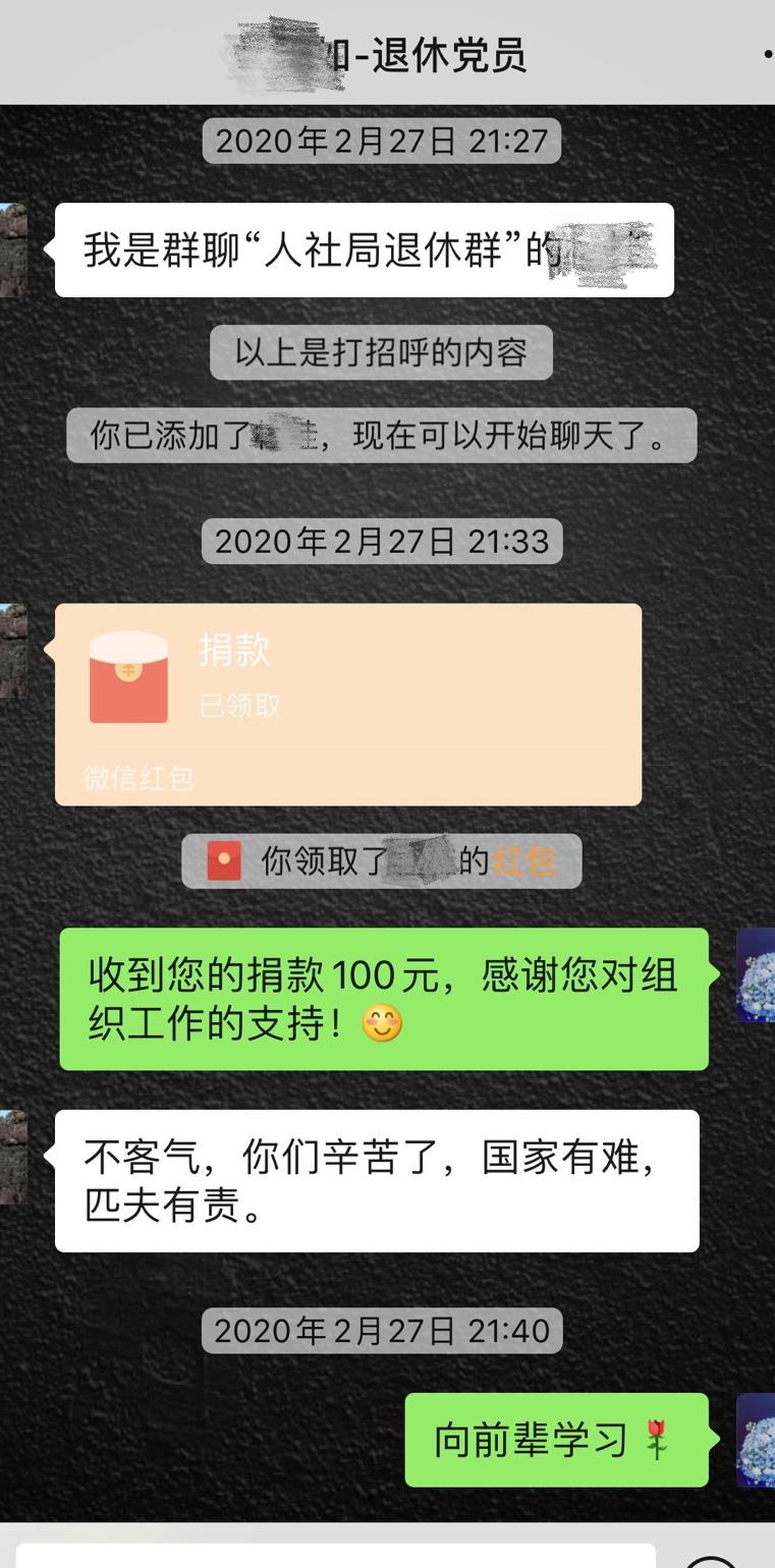 “国家有难、匹夫有责,国家有困难,我们这些老同志出一份绵薄之力是应该的”一名退休党员在群里说到。