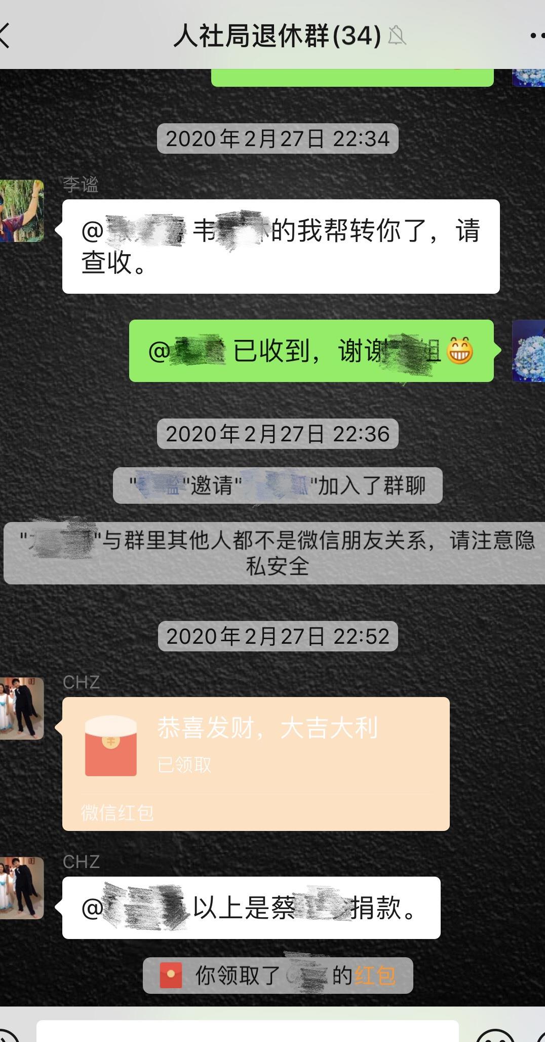 为了疫情防控捐款,市人社局机关退休支部微信群从下午一直“忙”到晚上22:52分,直到收到74岁老党员蔡华珍同志的捐款,人社机关退休支部微信群才恢复了往日的安静。