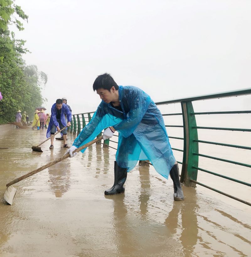 6月7日星期天,党员志愿者突击队员们六、七点钟就起床待命了。上午8:25,阴沉沉的天空还下着小雨,当社区发出洪水退去的信号,队员们二话不说,不顾风雨立刻出发前往清淤点。