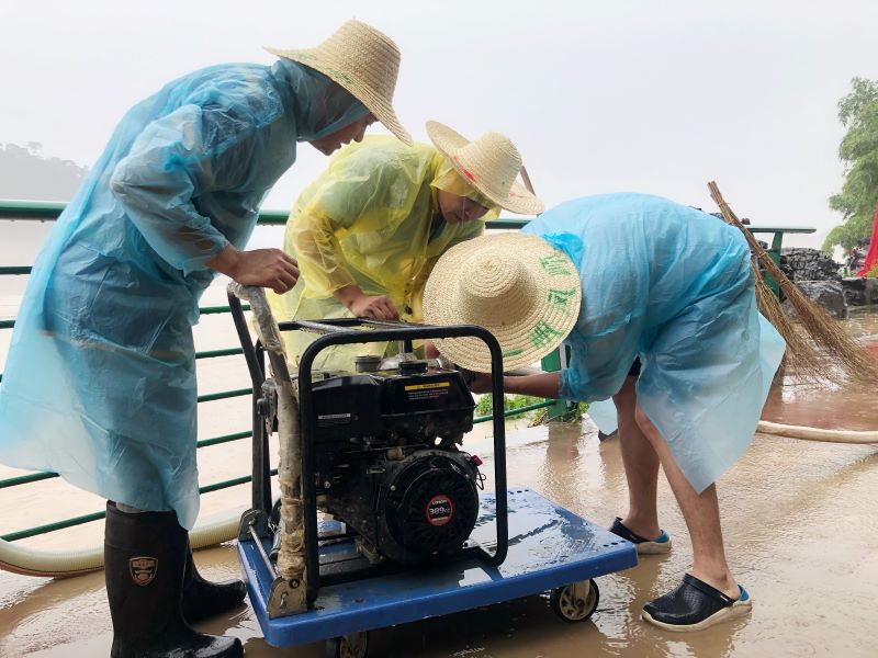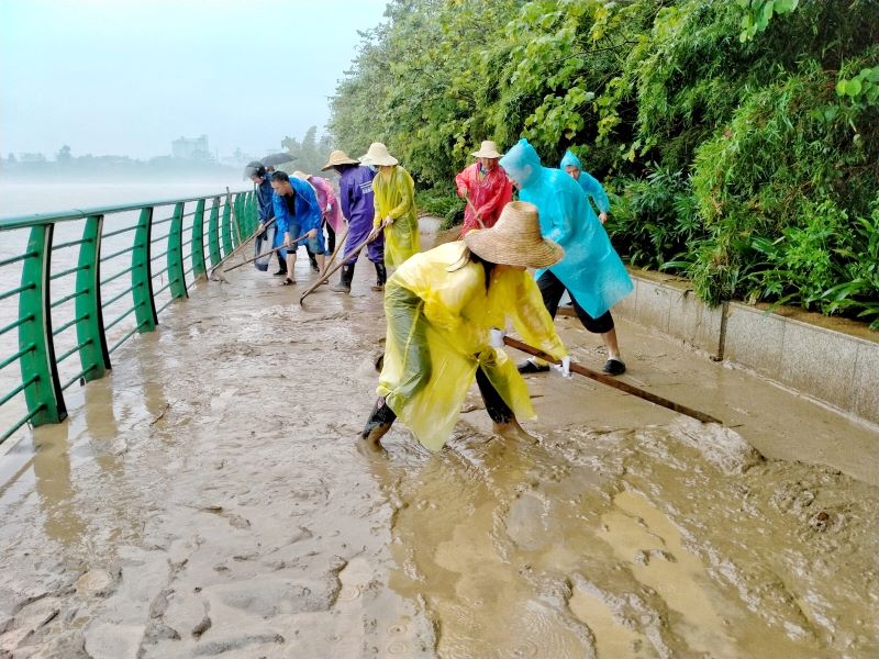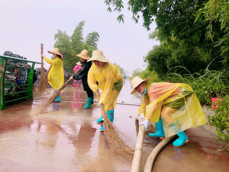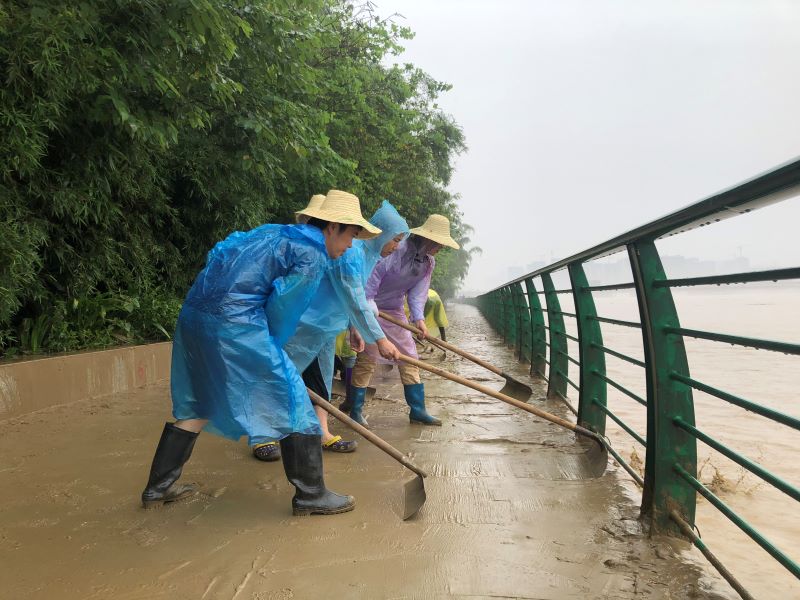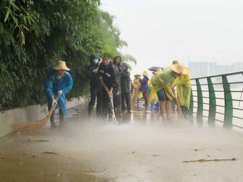 半小时内党员志愿者突击队员集结完毕,与文博社区及其他单位派出的志愿者汇合,带上草帽、穿上雨衣雨鞋,拿起扫把、铁铲、刮板和水枪等工具,说干就干!