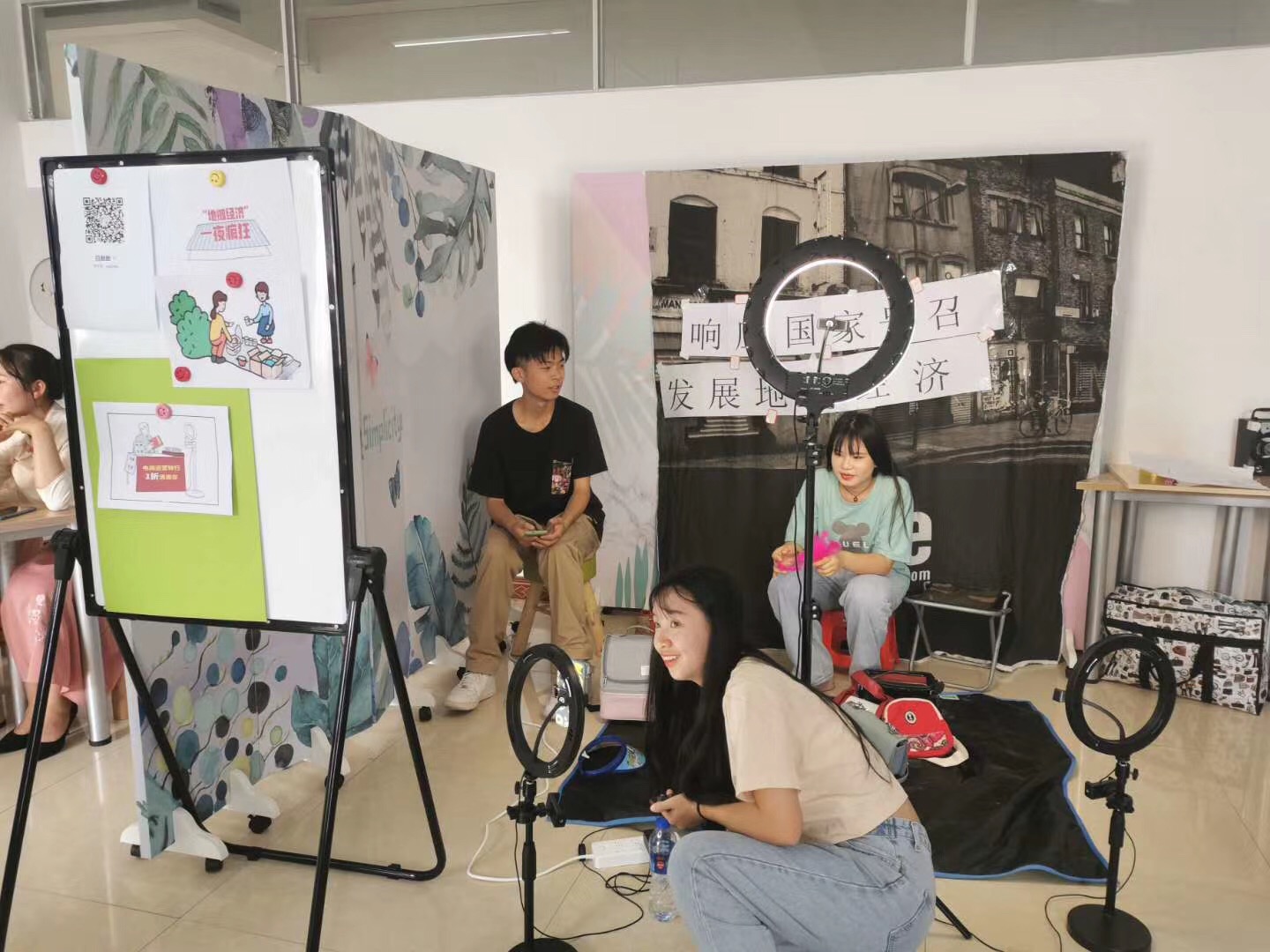 课程主要以“新手如何打造你的个人直播间”为中心内容,通过直播前的准备,直播间的创设过程,直播间的效果评价作为教学三步骤,授课教师采用一体化教学的行动导向法,引导学生根据直播类别进行直播间的划分,学生根据自己的喜好选择各自的直播专题,并进行直播间的特色打造。根据当下时事热点的“地摊经济”、“头盔经济”、“网红彩妆”,以及结合学校茶艺社“茶艺教学”划分为4个直播间。