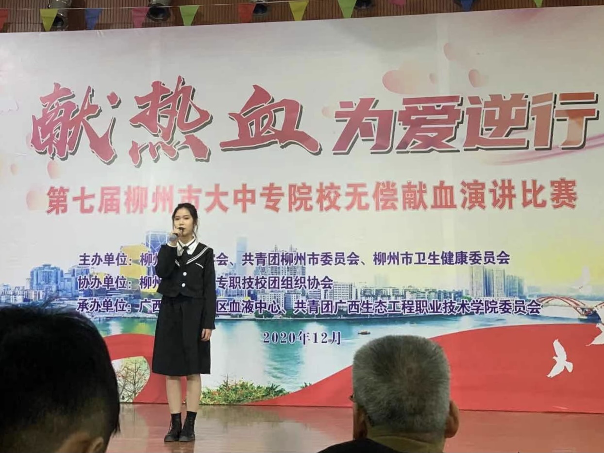 2020年12月26日上午,第七届柳州市大中专院校无偿献血演讲大赛在广西生态工程职业技术学院举行,柳州市技工学校组织一名学生代表参加比赛。通过一个上午激情澎湃的演讲比拼,柳州市技工学校代表荣获二等奖的佳绩。