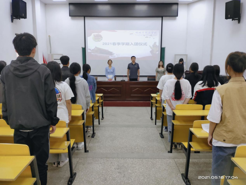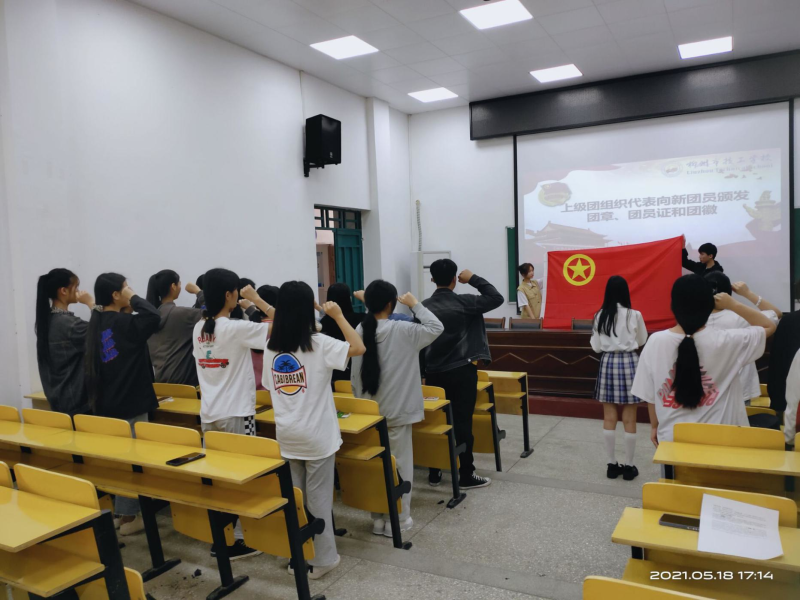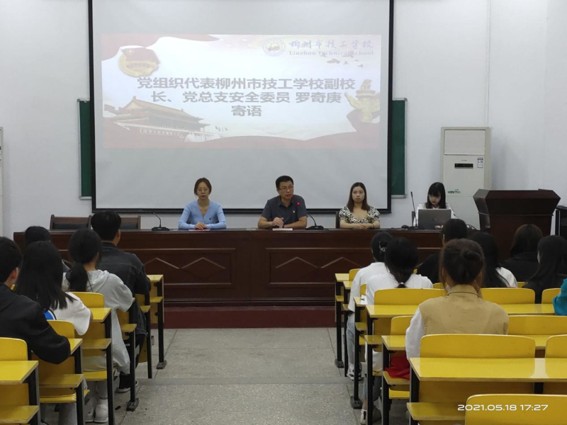 柳州市技工学校于2021年5月18日在革新校区阶梯教室举办了入团仪式暨“五四”青年节活动。出席本次活动的领导有柳州市技工学校党总支安全委员、副校长罗奇庚,校团委书记吴连娜。