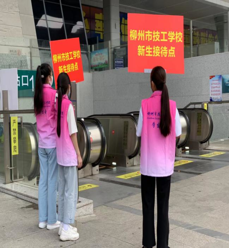 柳州市技工学校新生接待车到各车站点接待新生