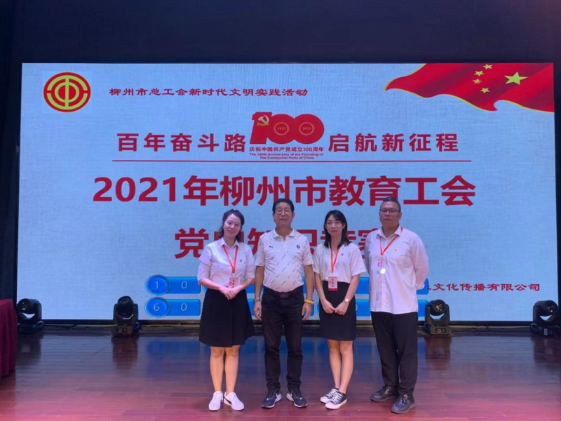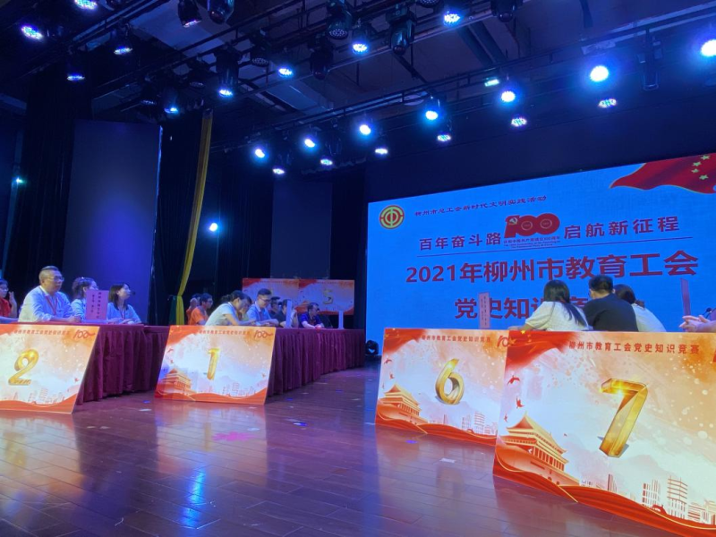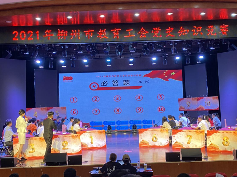 2021年9月11日,由柳州市教育工会主办的“建党百年辉煌成就,美丽龙城教工风采”党史知识竞赛在柳州市总工会大礼堂举行,共有来自全市教育系统30支队伍参加比赛。柳州市技工学校由学校党总支副书记、工会主席叶东哲同志带队,覃秀萍、李娟、叶青三位党员教师组成参赛队伍,参与了紧张激烈的比赛。