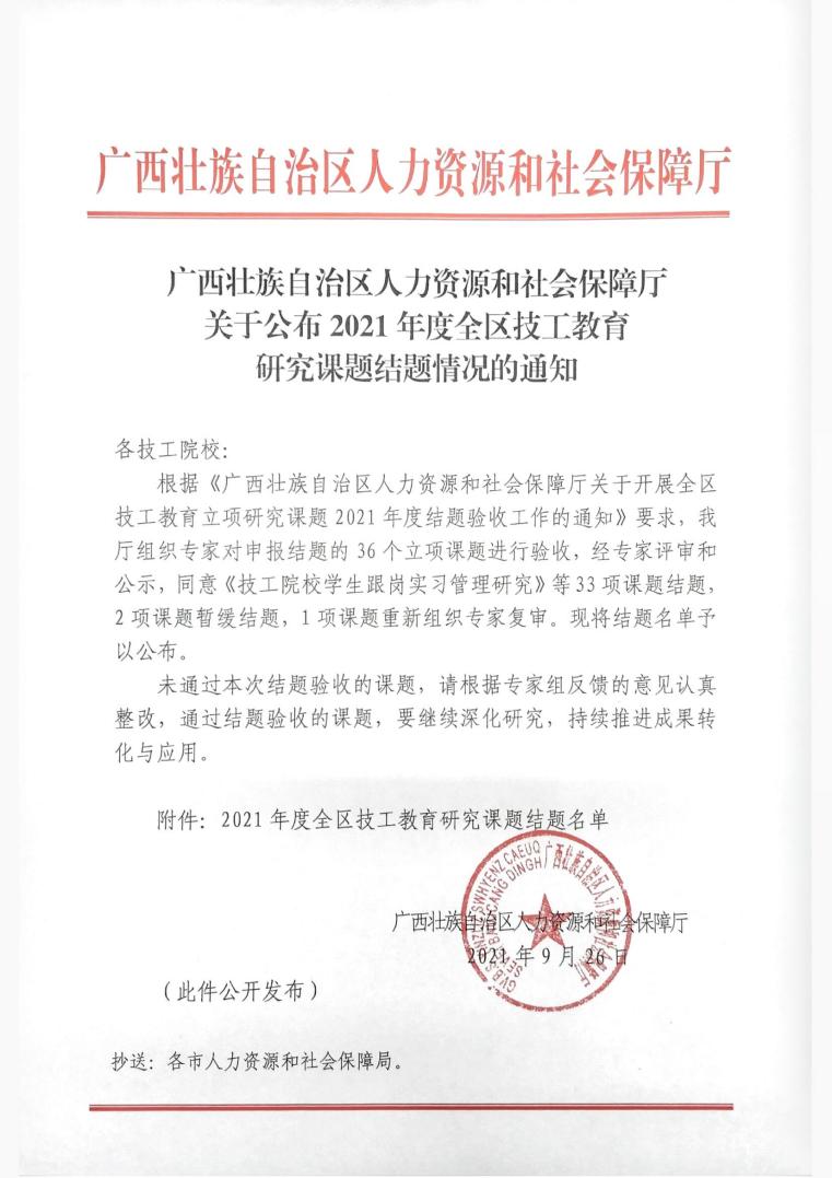 广西人社厅《关于公布2021年度全区技工教育研究课题结题情况的通知》红头文件