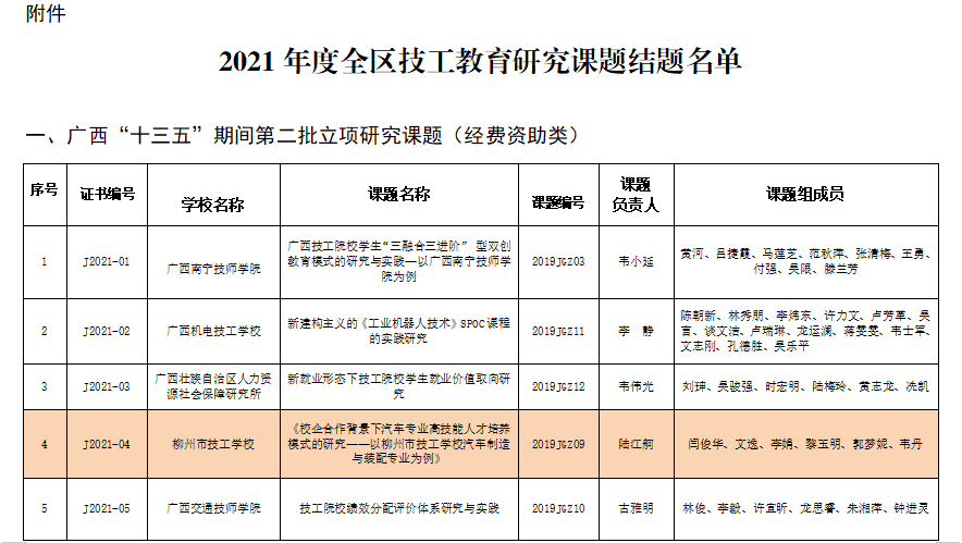 2021年9月,根据广西人社厅《关于公布2021年度全区技工教育研究课题结题情况的通知》,我校申报结题的广西技工教育“十三五”期间第二批立项科研课题《校企合作背景下汽车专业高技能人才培养模式的研究——以柳州市技工学校汽车制造与装配专业为例》,经广西壮族自治区人力资源和社会保障厅组织专家严格评审,顺利通过结题验收!