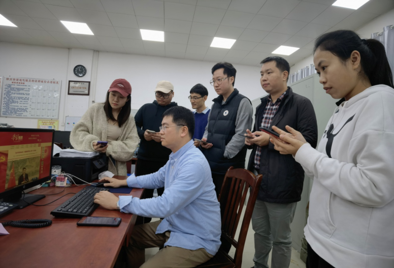 柳州市技工学校第四党支部书记蒋建斌向科室人员讲解“学习强国”平台
