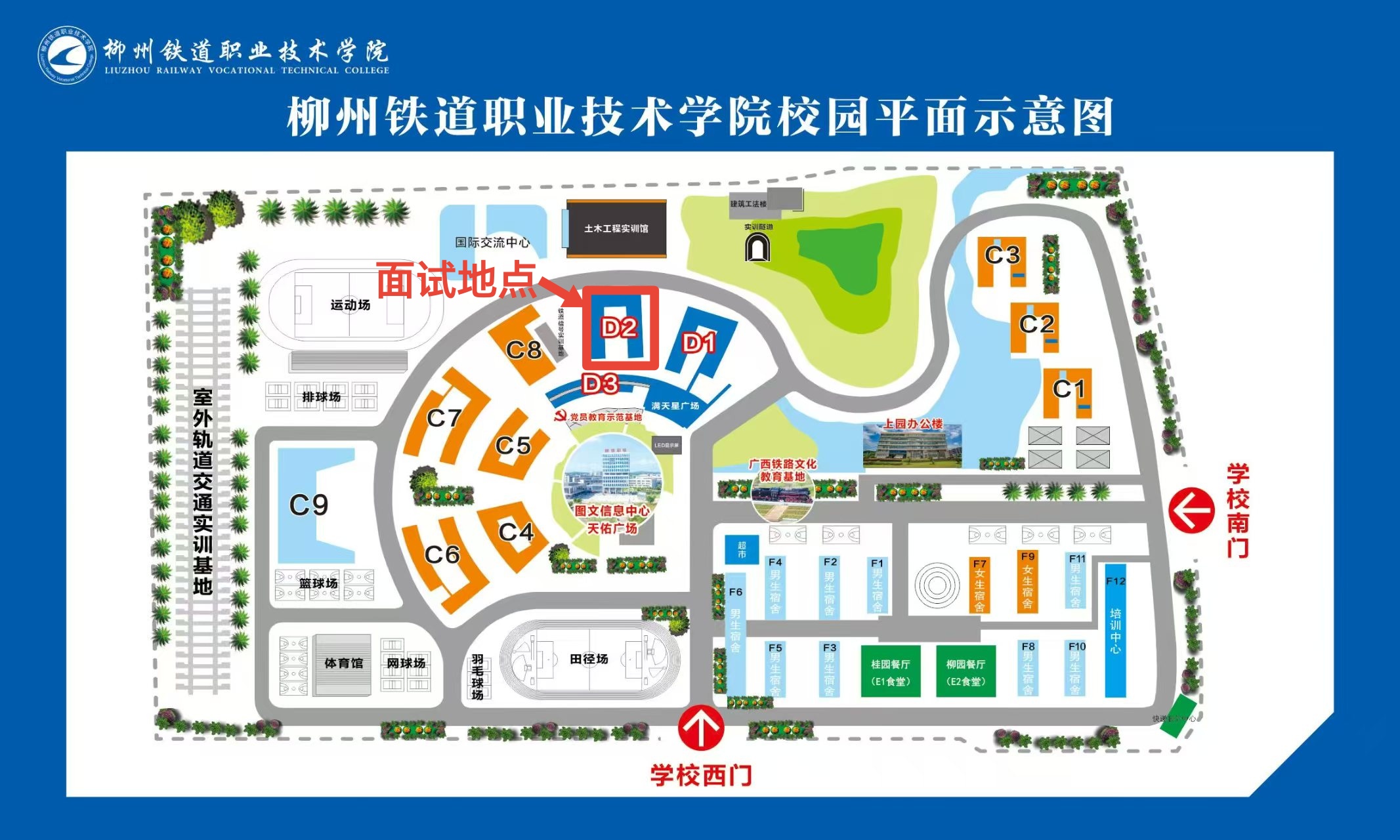 2.面试地点:广西柳州市鱼峰区文苑路2号柳州铁道职业技术学院D2教学楼2楼,面试候考室在D3教学楼202教室。