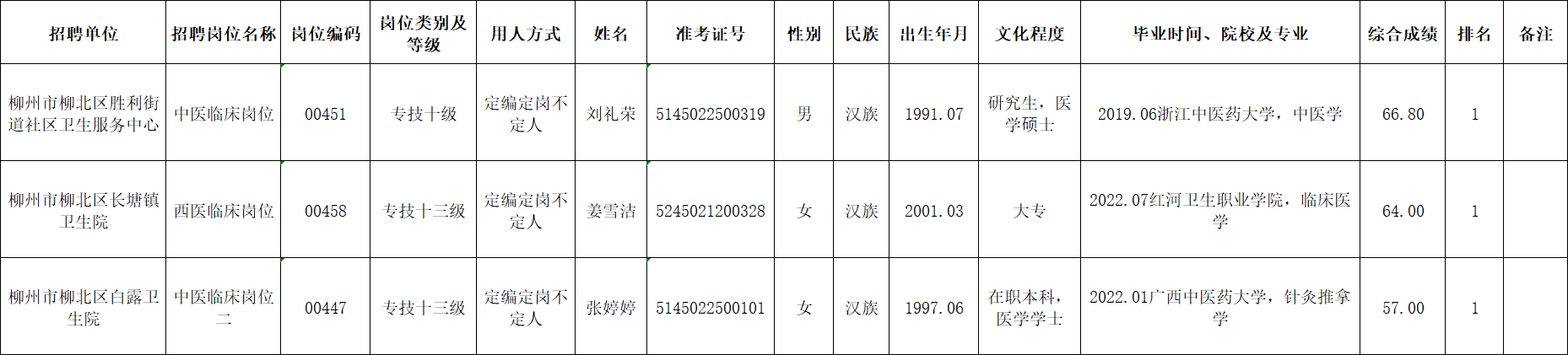根据《柳州市2025年度上半年事业单位公开考试招聘工作人员公告》要求及安排,刘礼荣等3名同志经面试、考核、体检合格,符合聘用条件。经研究决定,拟聘用刘礼荣等3名同志为我区事业单位工作人员,现予以公示,公示期为7日(2025年8月4日至2025年8月10日)。对拟聘用的同志如有异议,请以书面形式,并署真实姓名和联系地址,于2025年8月10日前邮寄或直接送我单位(地址:柳州市柳北区鹧鸪江6队南200米(北外环路南)5楼512办公室;邮编:545002,电话0772-2802642),群众如实反映有关问题受法律保护。