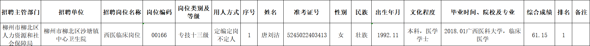 根据《柳州市2025年度下半年事业单位公开考试招聘工作人员公告》要求及安排,唐刘洁同志经面试、考察、体检合格,符合聘用条件。经研究决定,拟聘用唐刘洁同志为我区事业单位工作人员,现予以公示,公示期为5个工作日(2026年1月22日至2026年1月28日)。对拟聘用的同志如有异议,请以书面形式,并署真实姓名和联系地址,于2026年1月28日前邮寄或直接送我单位(地址:柳州市柳北区鹧鸪江六队南200米(北外环路南)柳北区卫生健康局512室;邮编:545002,电话0772-2802642),群众如实反映有关问题受法律保护。