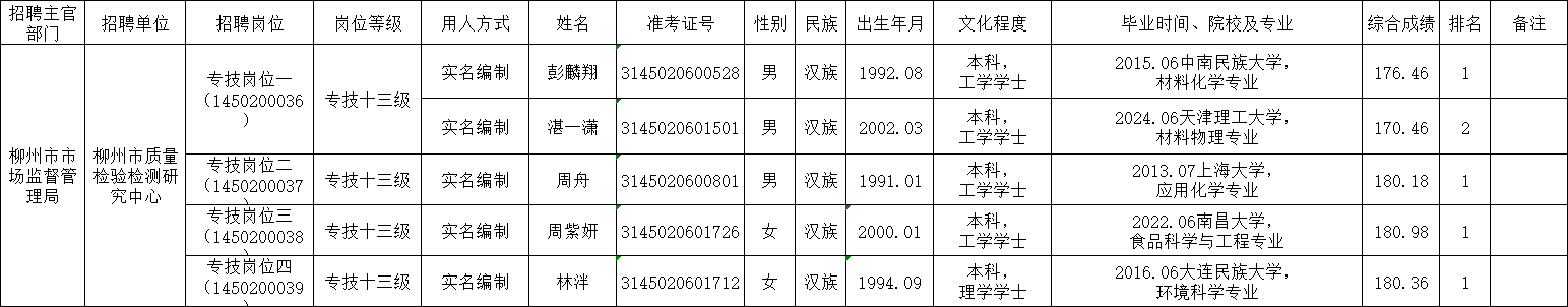 2024年柳州市市场监督管理局直属事业单位公开考试招聘工作人员拟聘用人选公示
