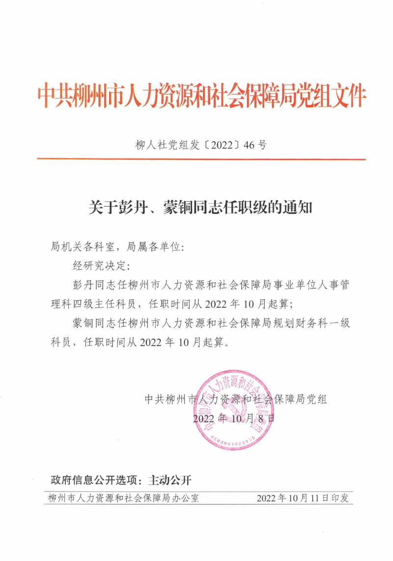 柳人社党组发〔2022〕46号 关于彭丹、蒙铜同志任职级的通知