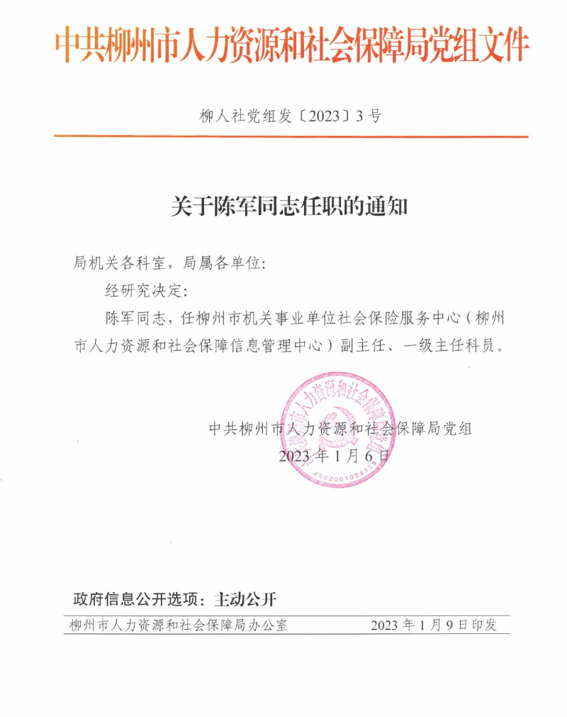 柳人社党组发〔2023〕3号 关于陈军同志任职的通知