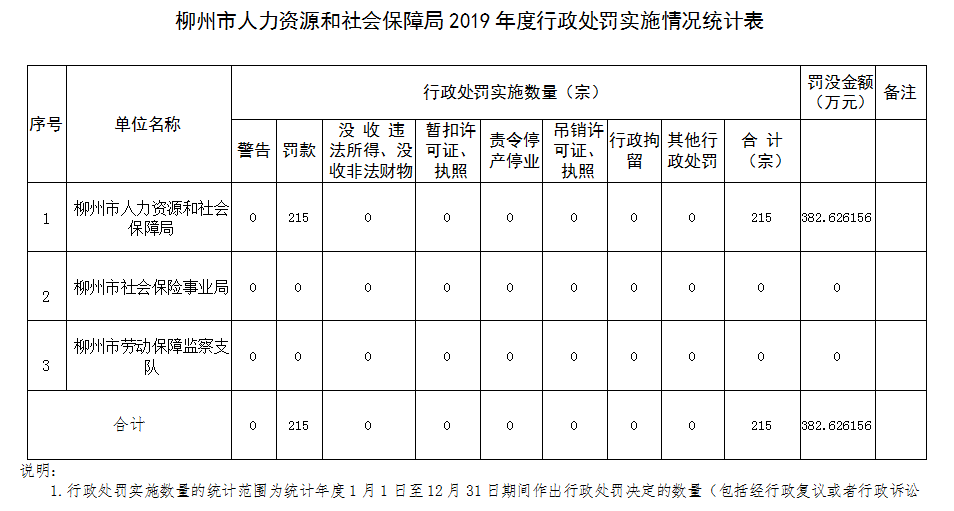 柳州市人力资源和社会保障局2019年度行政处罚实施情况统计表