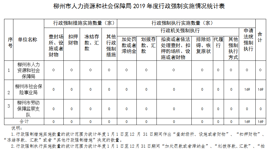 柳州市人力资源和社会保障局2019年度行政强制实施情况统计表