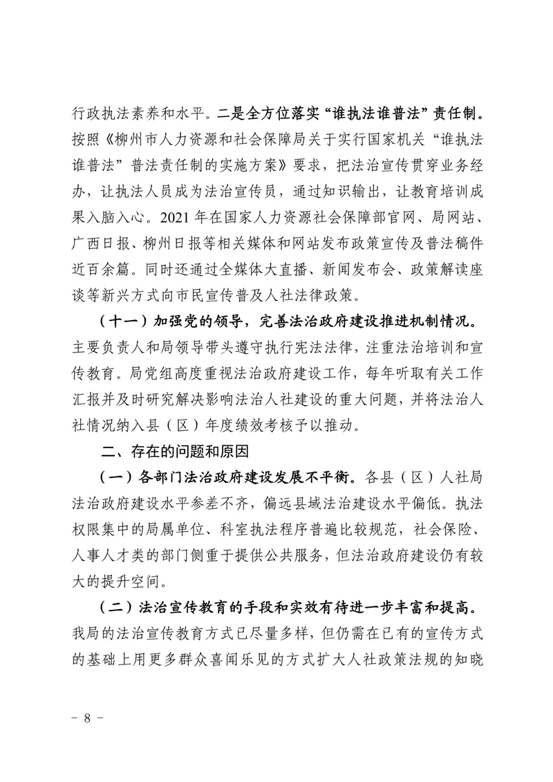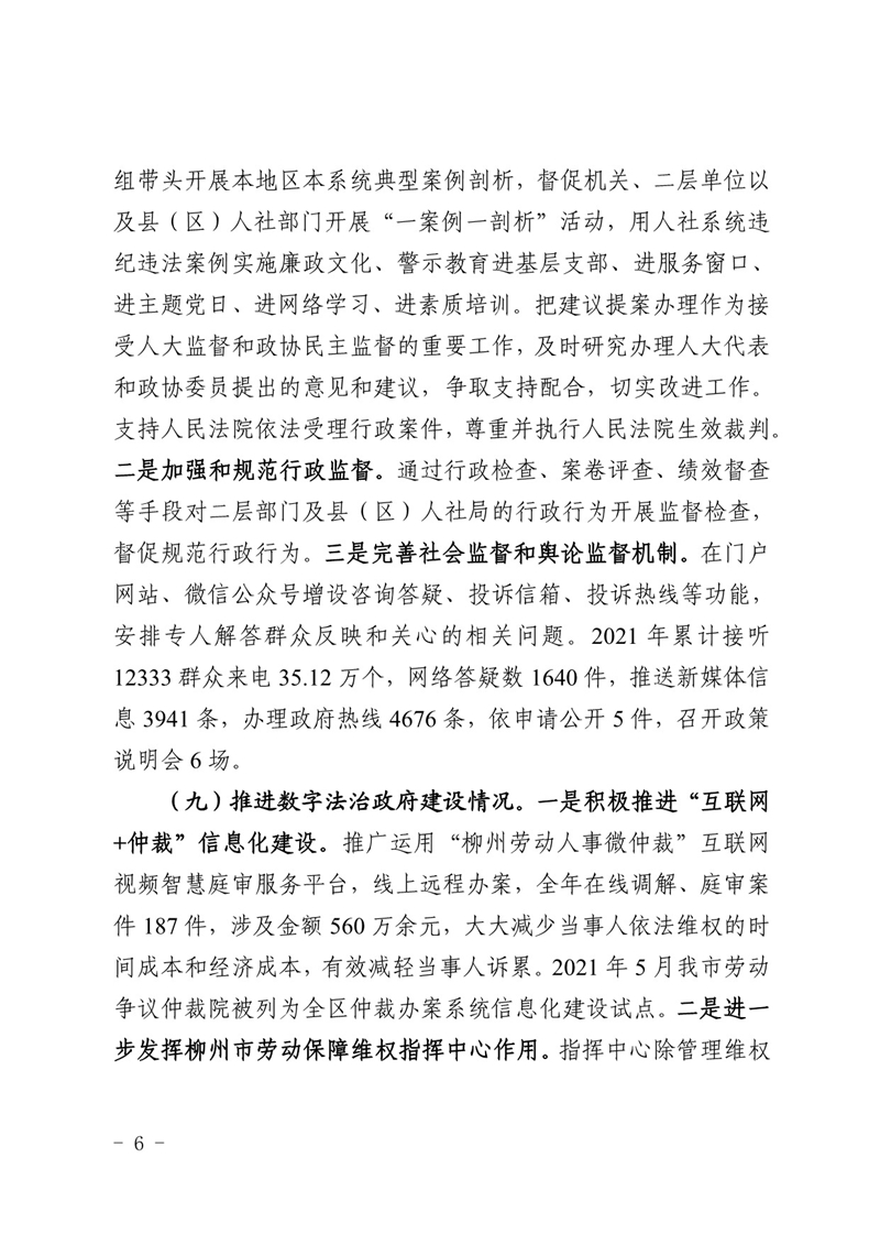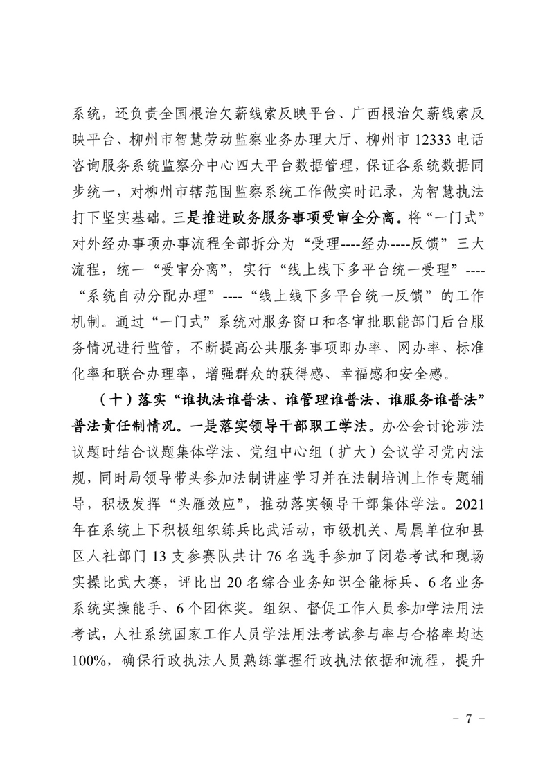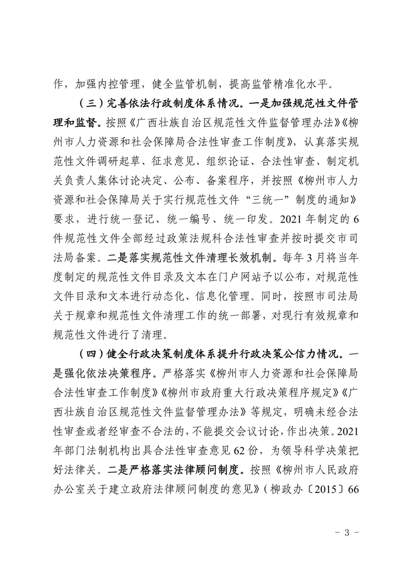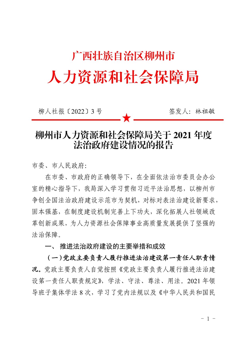 柳人社报〔2022〕3号 柳州市人力资源和社会保障局关于2021年度法治政府建设情况的报告